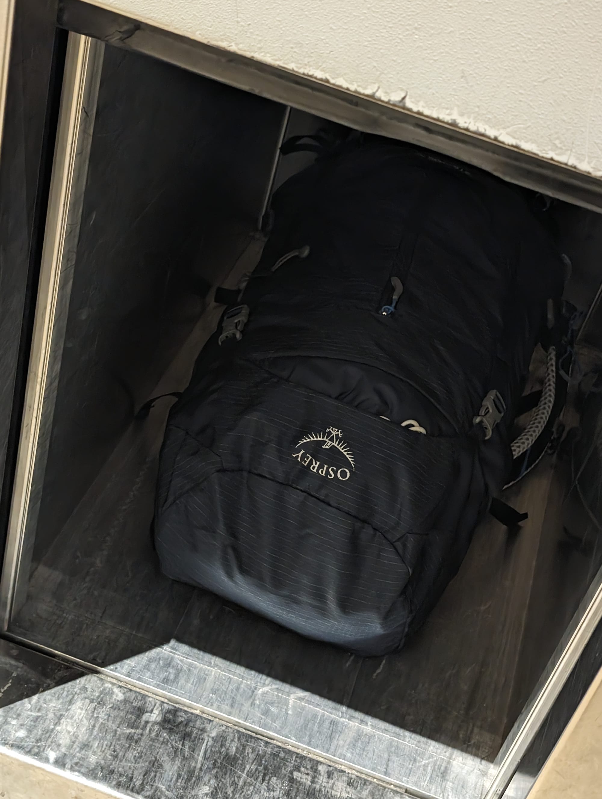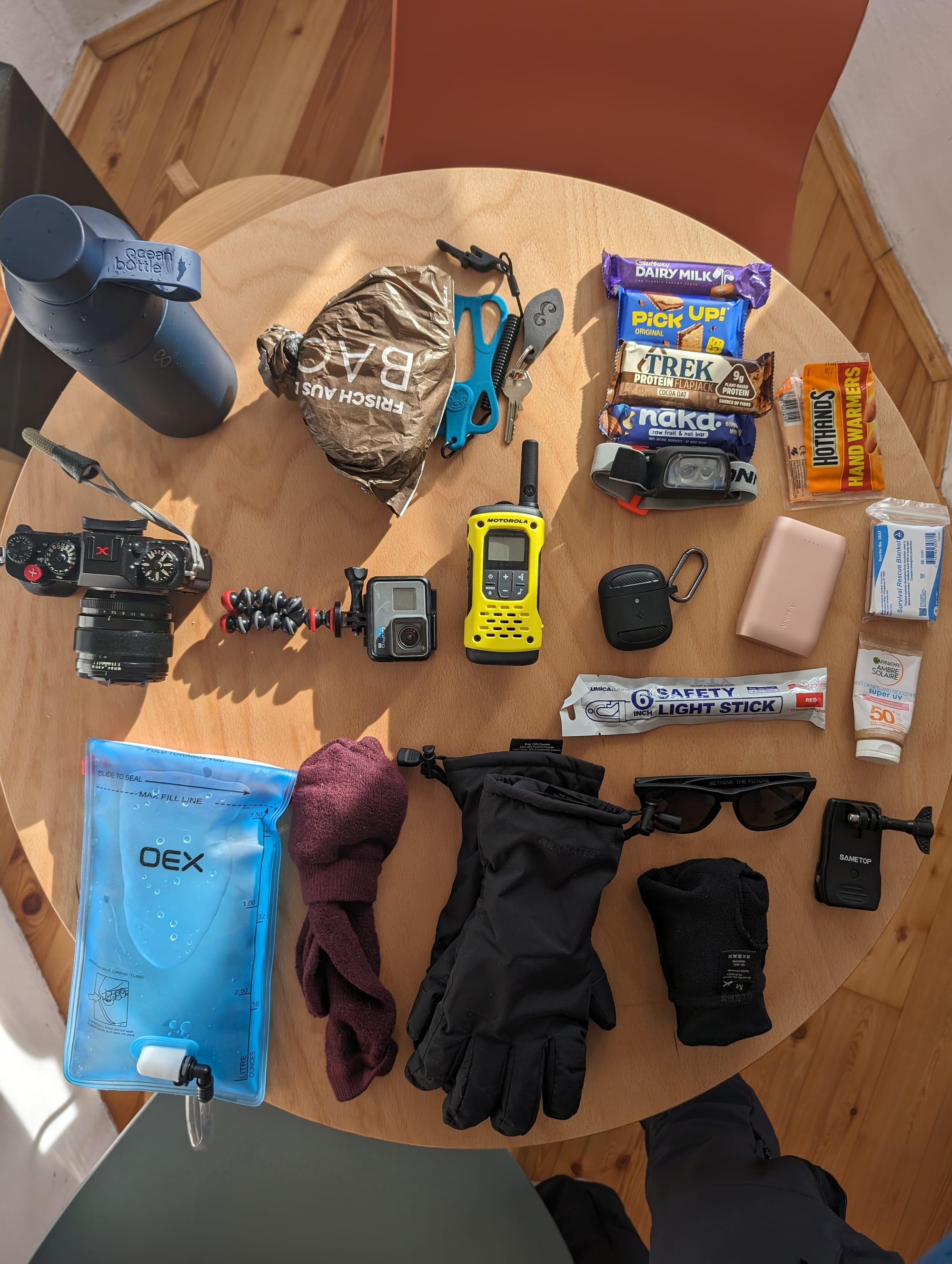 Included in the kit was; 4 different snacks + sandwich, a single walkie-talkie (good luck finding the logic), a glow stick, an emergency space blanket and a water bladder that started to freeze as I got into the sub-zero mountain ranges.