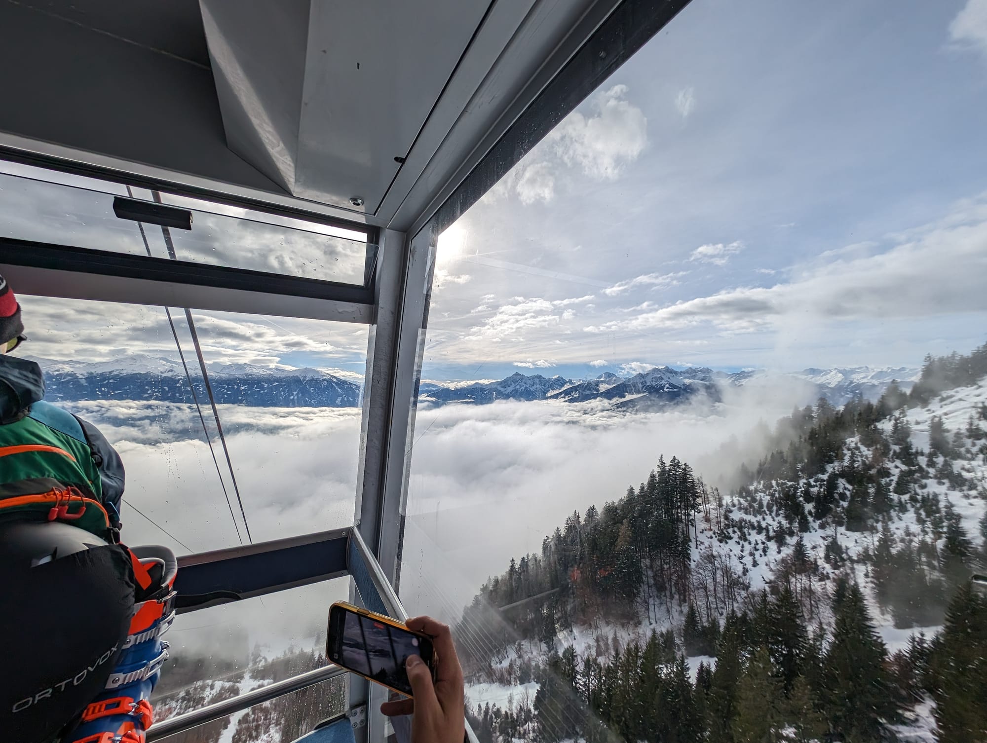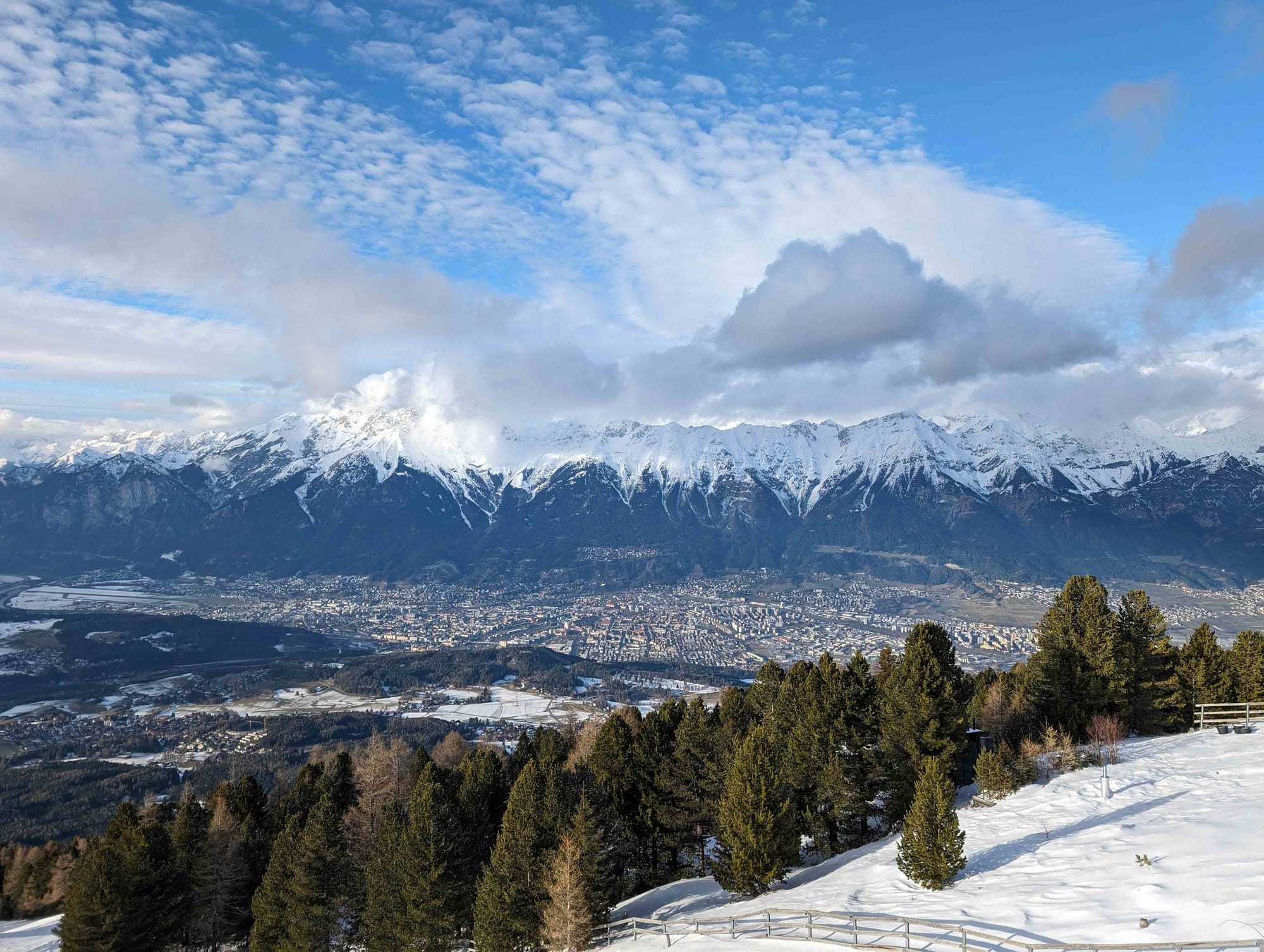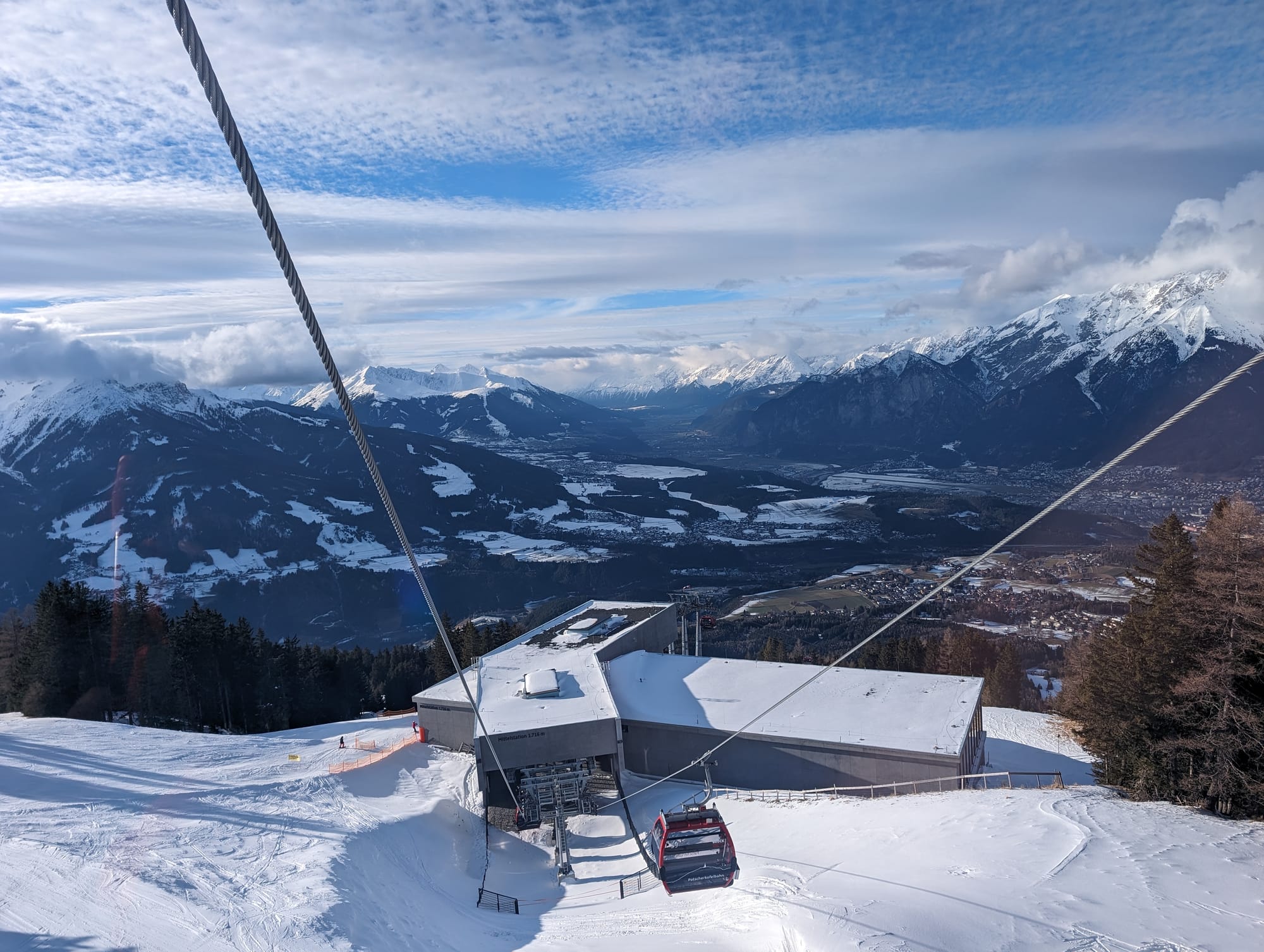 I spent a couple of hours enjoying the views, and wandering the peak snapping photos looking across the city and back behind us over to the peaks jutting out above the neighbouring valleys and enjoying some hot drinks at the restaurant, looking down on the city way below us. I started to appreciate that the skiing holidays much just partly be getting to go up big mountains and taking in the view. I started to see the appeal.