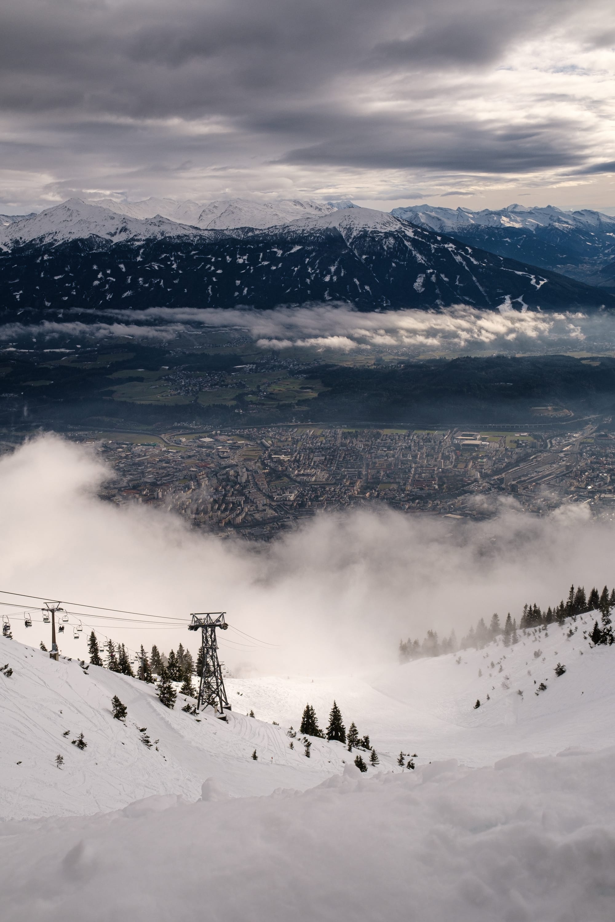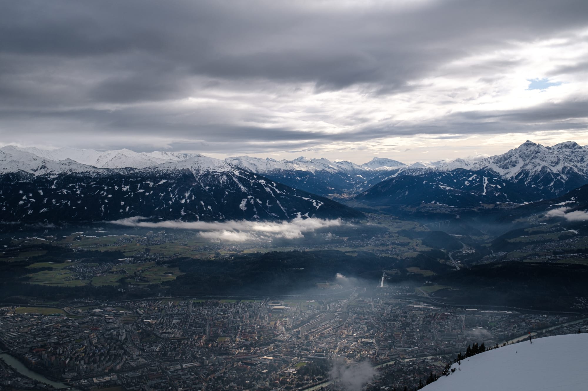 Mix of shots looking over the valley to the mountains in the north, and down into Innsbruck from Nordkette. Again, playing with tones and colour to shift mood