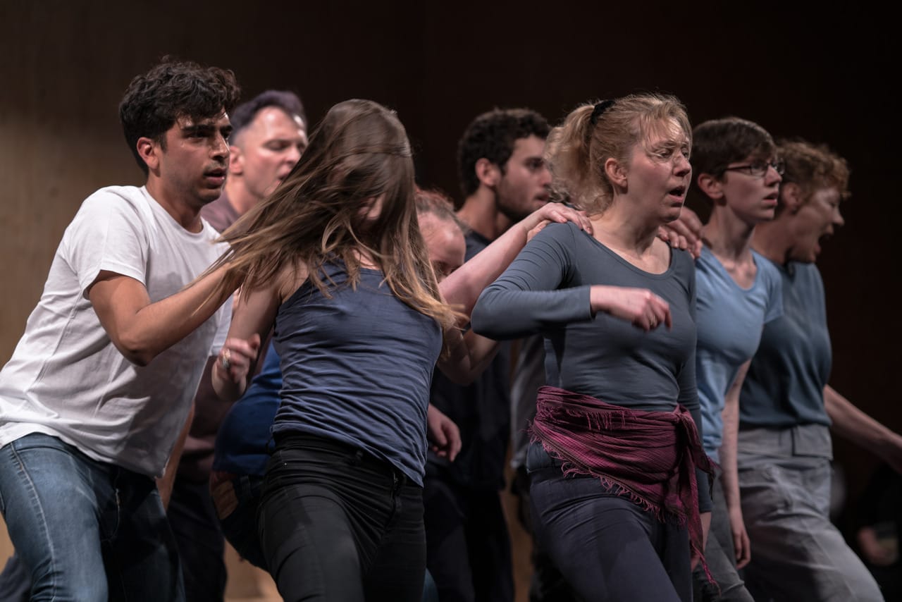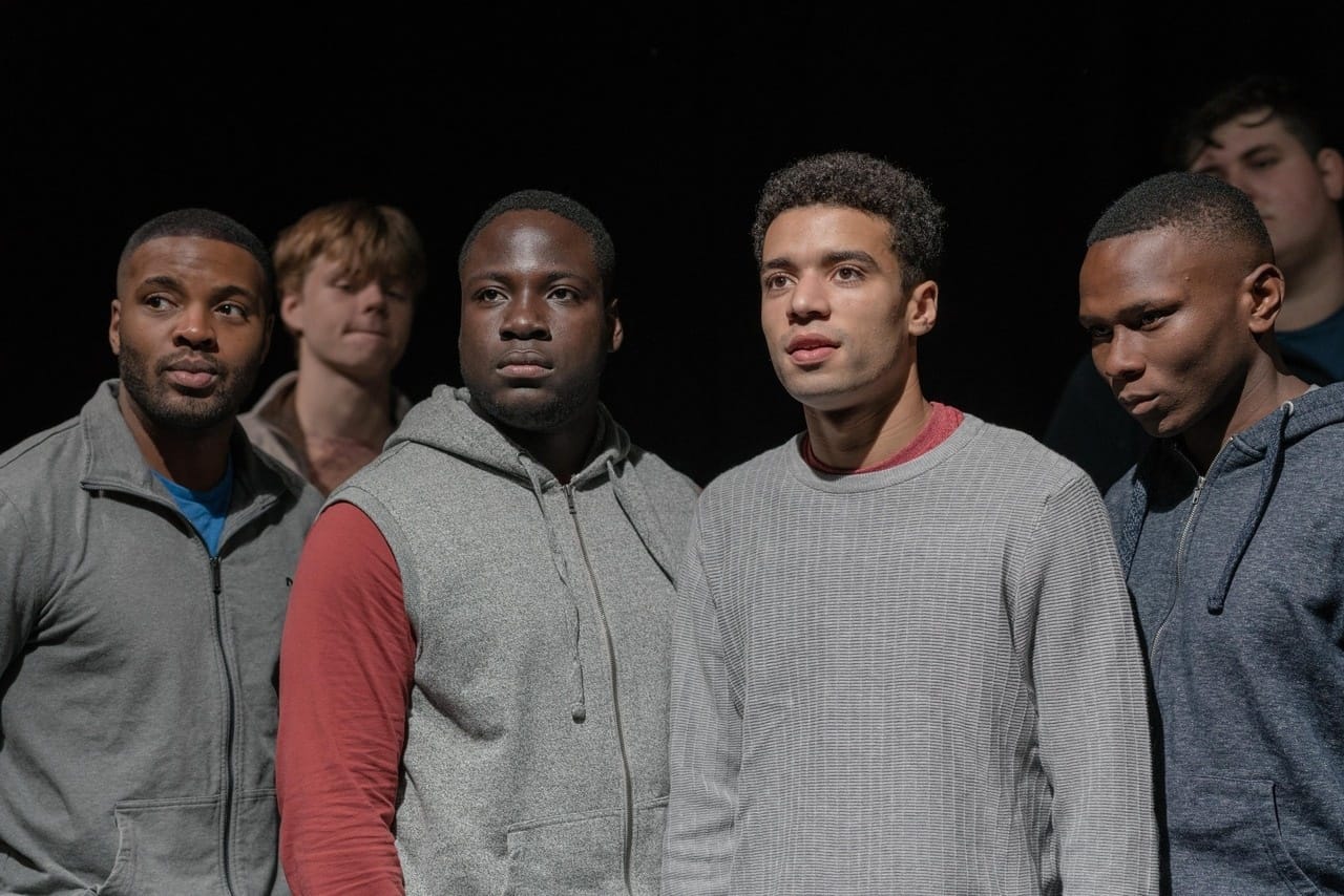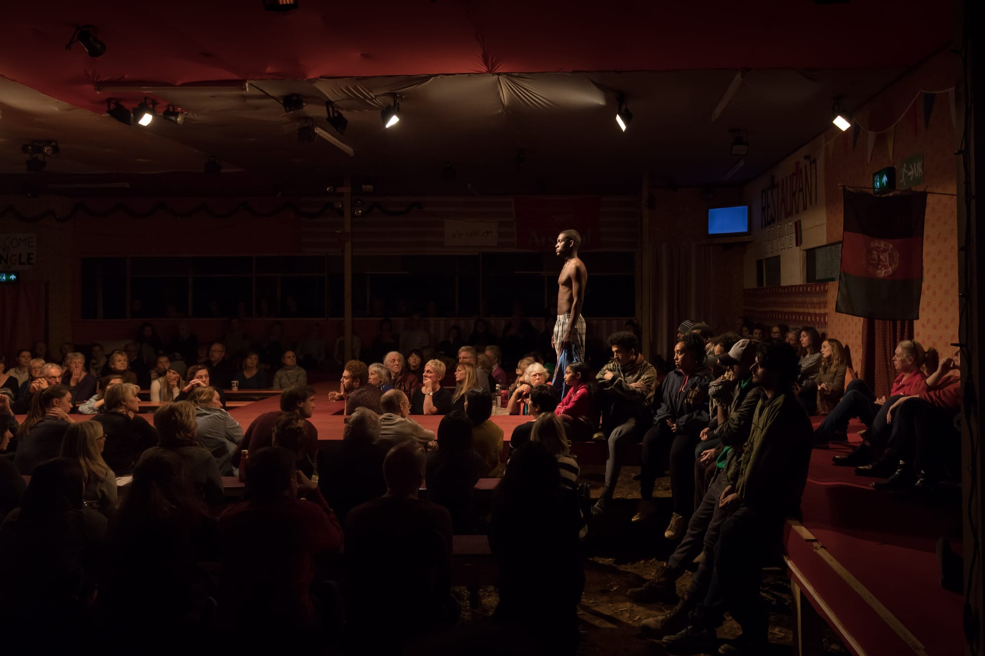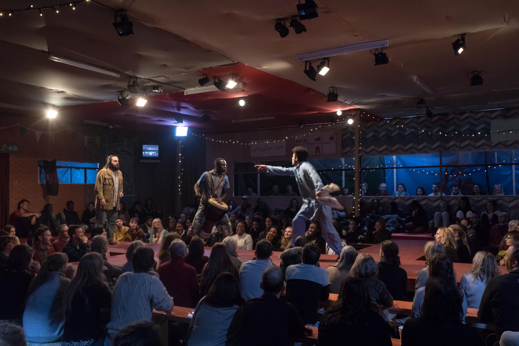 The Jungle, Young Vic. By Joe Murphy & Joe Robertson. Direction Stephen Daldry & Justin Martin. Design Miriam Buether. Costumes Catherine Kodicek. Light Jon Clark. Sound Paul Arditti. Musical Direction / Composition John Pfumojena. Video Tristan Shepherd.