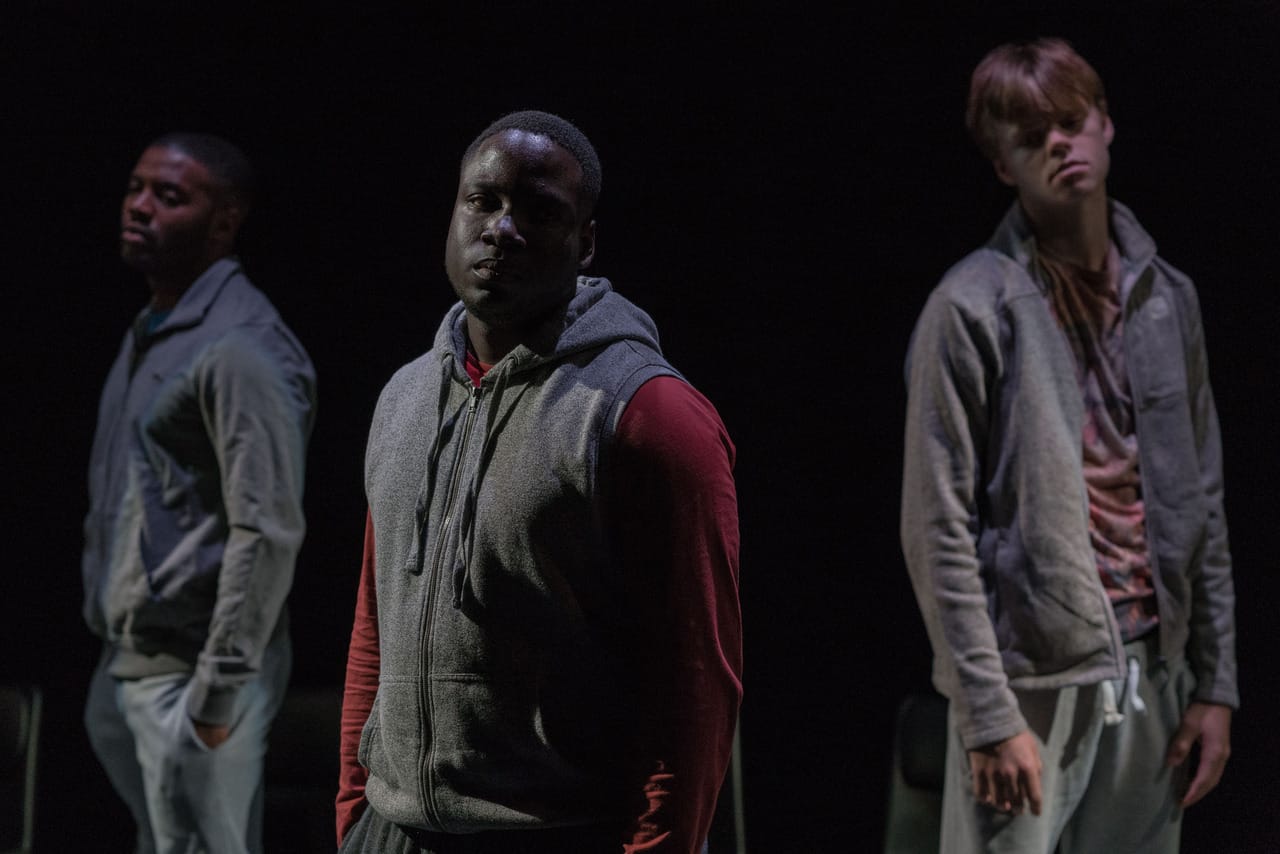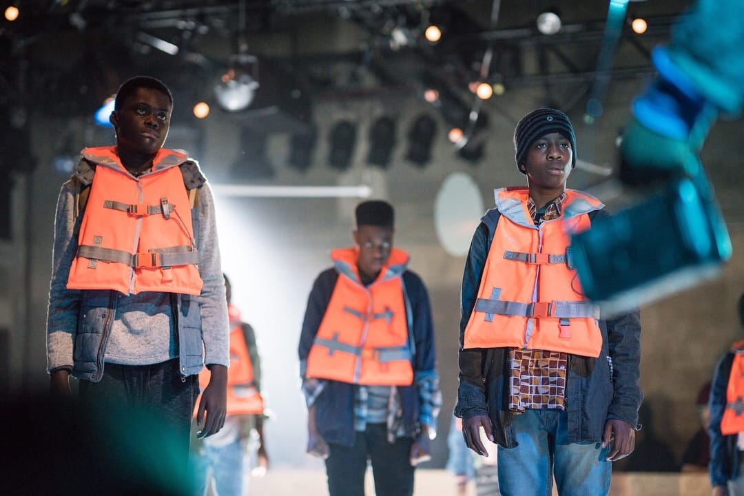The Jungle, Young Vic. By Joe Murphy & Joe Robertson. Direction Stephen Daldry & Justin Martin. Design Miriam Buether. Costumes Catherine Kodicek. Light Jon Clark. Sound Paul Arditti. Musical Direction / Composition John Pfumojena. Video Tristan Shepherd.